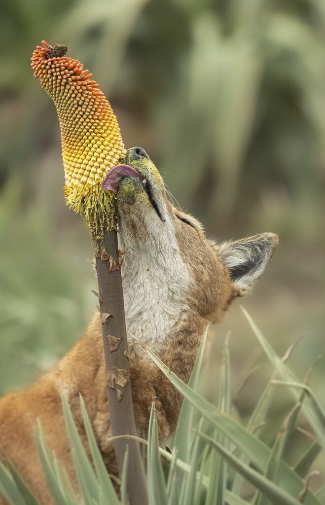 👉 le loup d’Éthiopie butine les fleurs de Kniphofia, léchant leur nectar comme le ferait un insecte pollinisateur.